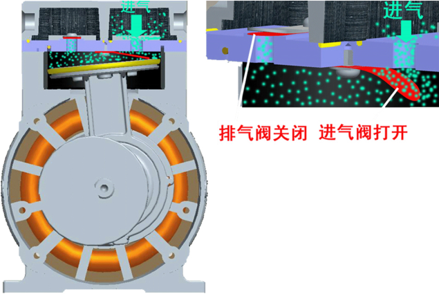 定子進(jìn)排出口分離開來,周而復(fù)始運(yùn)轉(zhuǎn),進(jìn)行變?nèi)?,將吸入氣體,從排氣口排出,從而達(dá)到抽氣目的。
