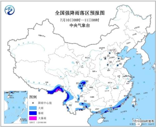 7月10日,據(jù)中央氣象臺網站消息,四川盆地西部、福建、廣東等地仍有較強降雨。預計,7月10日08時至11日08時,福建東南部、廣東東部和南部、廣西沿海、云南東南部和西部、四川盆地西部、西藏東南部等地有大到暴雨,其中,西藏東南部局地有大暴雨(100~120毫米),上述部分地區(qū)伴有短時強降水(最大小時降水量20~50毫米,局地可達60毫米以上)、局地有雷暴大風等強對流天氣。中央氣象臺7月10日6時發(fā)布暴雨藍色預警。