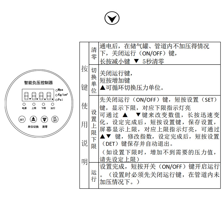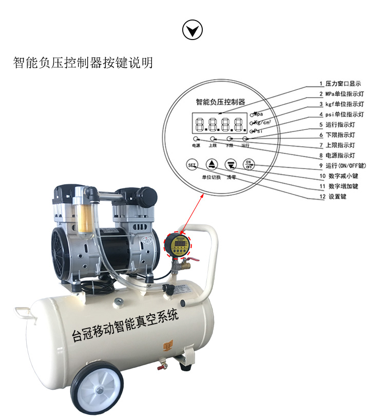 智能壓力控制器:高精度光電原理控制,0-負(fù)98KPA內(nèi)自由調(diào)節(jié)上限(停止),下限(啟動(dòng))。
